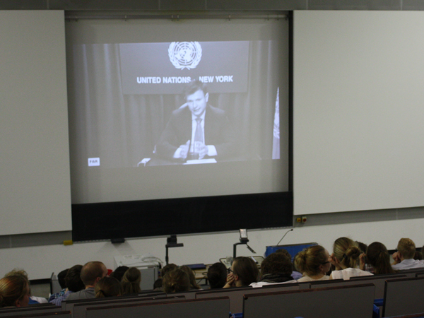 Nach einer Einführung in die Thematik von Prof. Dr. Gisela Müller-Brandeck-Bocquet wurde Herr Shuhrat Sulaymanov aus dem Hauptsitz der Vereinten Nation zugeschaltet. Zunächst gab es einen Überblick zur derzeitigen Lage in Syrien. Anschließend gab es einen Dialog zwischen Würzburg und New York bei dem die Möglichkeit bestand Fragen direkt live zu stellen und per Bild und Ton miteinander zu kommunizieren.